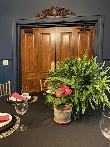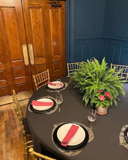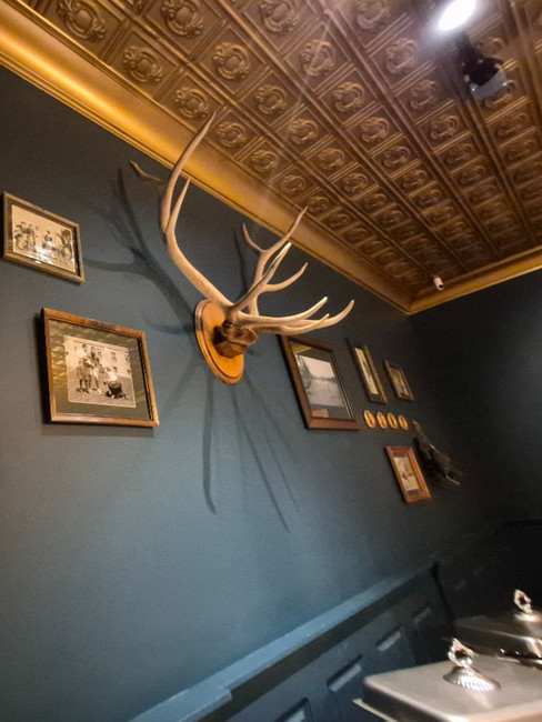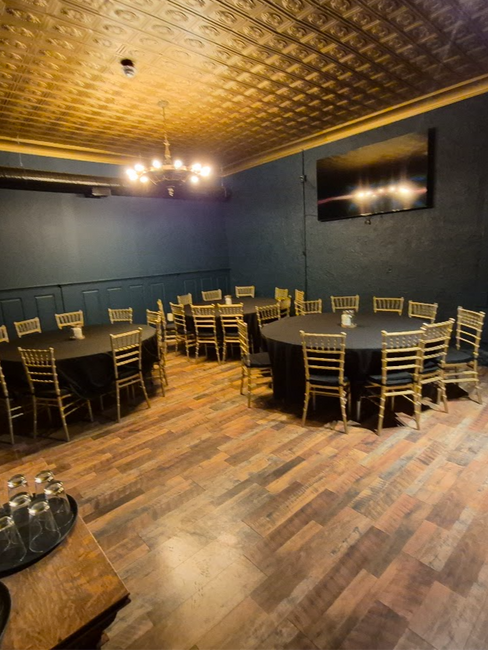 • A private event space accommodating roughly 40 guests, designed with the same level of intentional detail found throughout the venue. The room features deep blue walls, historic architectural elements, a patterned tin ceiling, warm wood flooring, and curated décor including framed vintage imagery and mounted stag accents that reinforce the Scottish-inspired theme. Round tables provide flexible seating for gatherings ranging from birthdays to corporate events. The result is a space that feels both elevated and comfortable—more like a private club room than a rented hall—while still connected to the energy of the larger venue.