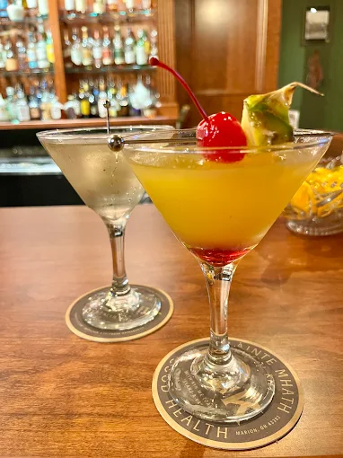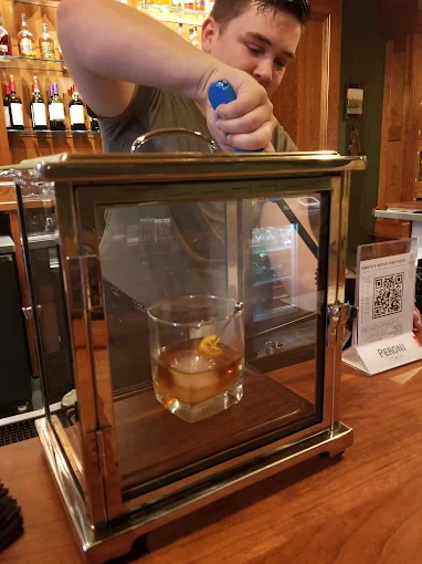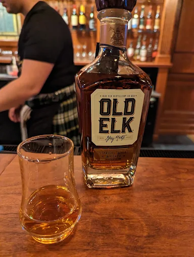 • A full-service bar anchored by a robust, whisky-forward program, set within a custom-built wood bar that immediately establishes the tone of the space. Backlit shelving displays an extensive selection of Scotch and bourbon, alongside signature cocktails, classic mixed drinks, Ohio craft beer, domestic and imported beers, and a curated wine offering. The bar leans into its Scottish identity without limiting choice, offering depth for enthusiasts while remaining accessible for casual guests. It’s not just a place to order a drink—it’s a place to sit, stay, and engage. Though they don’t operate a full-service kitchen, they serve pub-style pizza and specialty hot dogs known as “Scottie Dogs.”